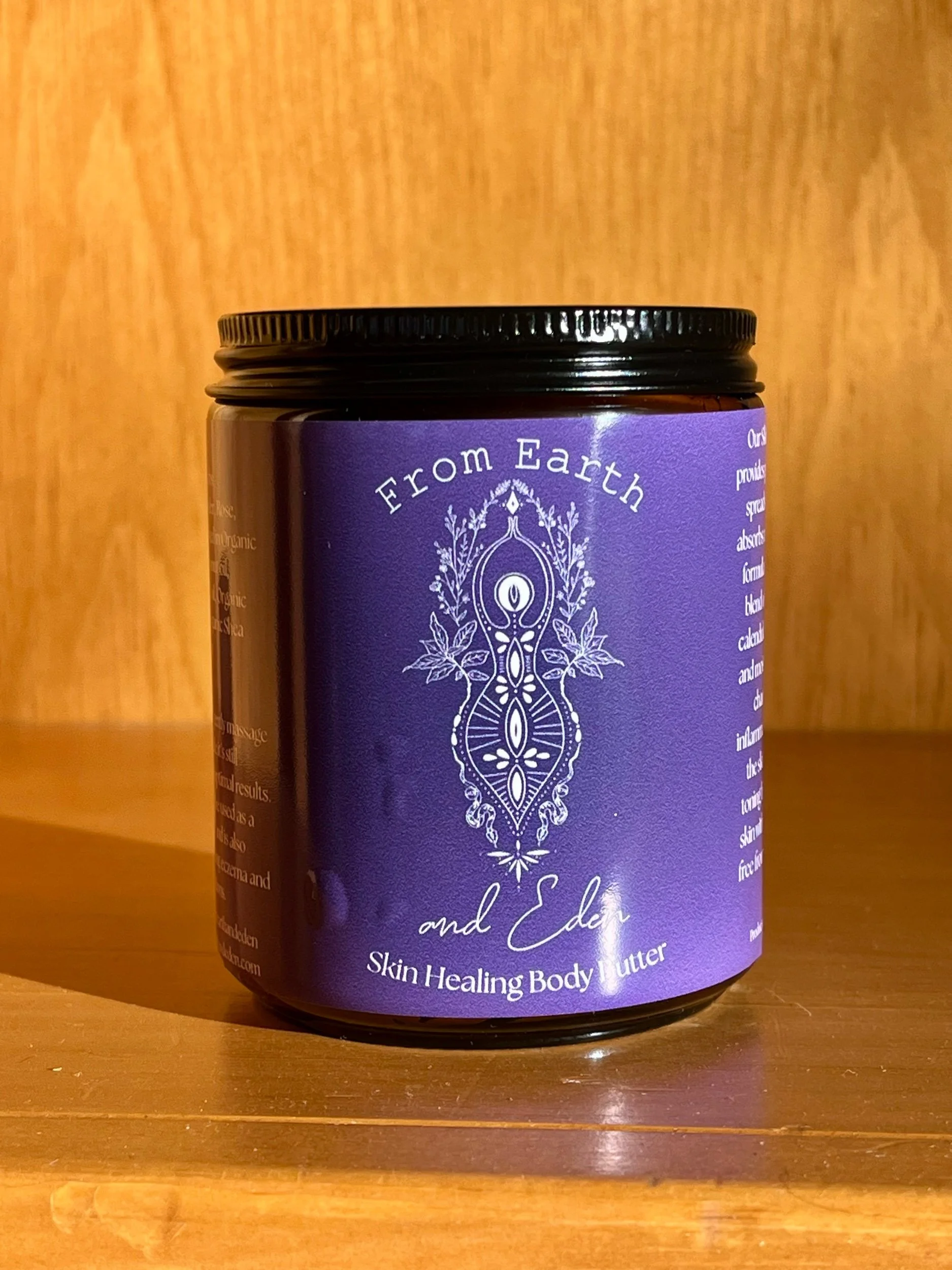 Our Skin Healing Butter provides powerful hydration, spreads effortlessly, and absorbs rapidly. This healing formula is enriched with a blend of herbs, featuring calendula for cellular repair and moisture, lavender and chamomile to calm inflammation on or beneath the skin, and rose for its toning benefits. Treat your skin with this gentle butter, free from preservatives and toxins.